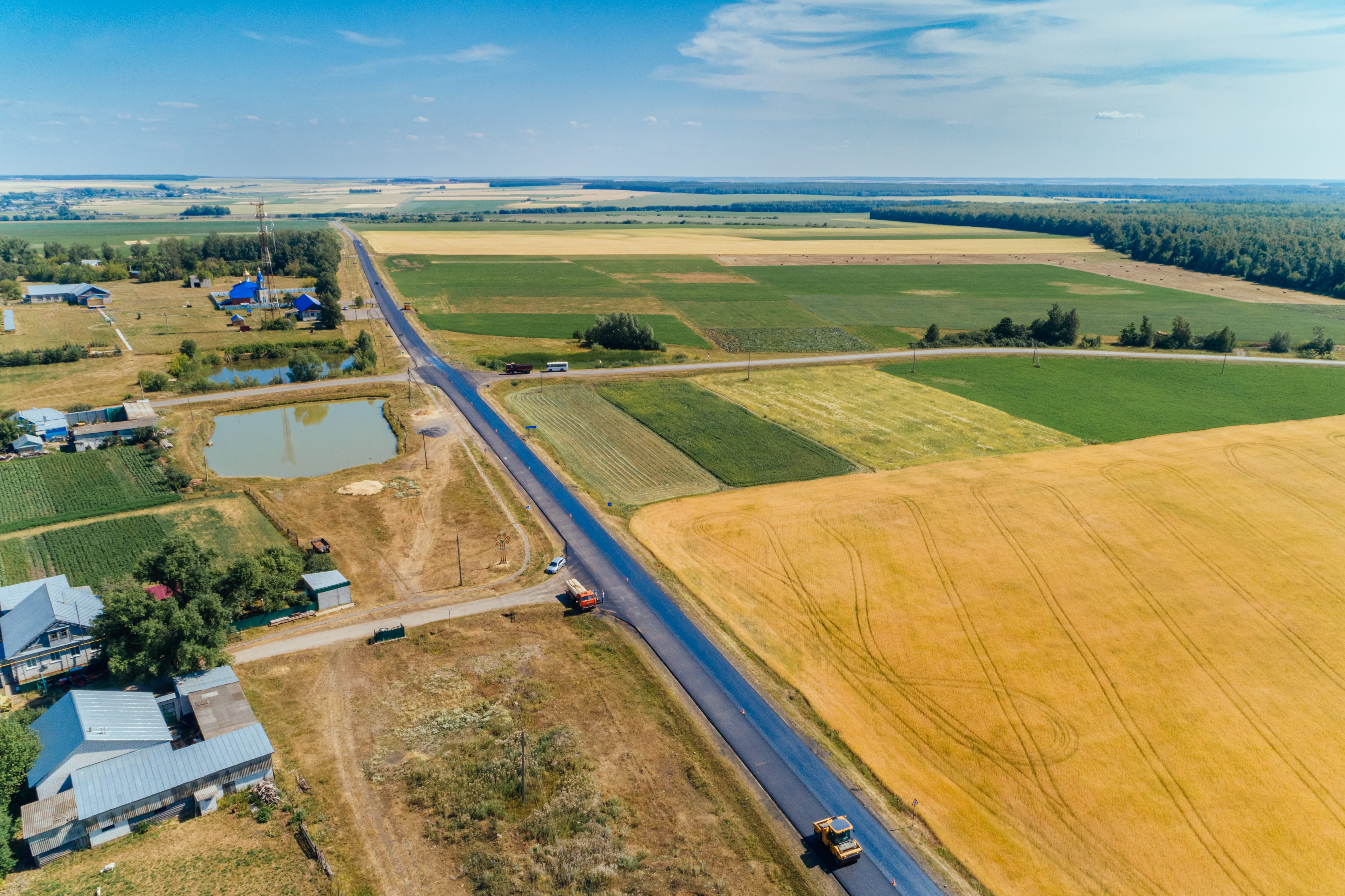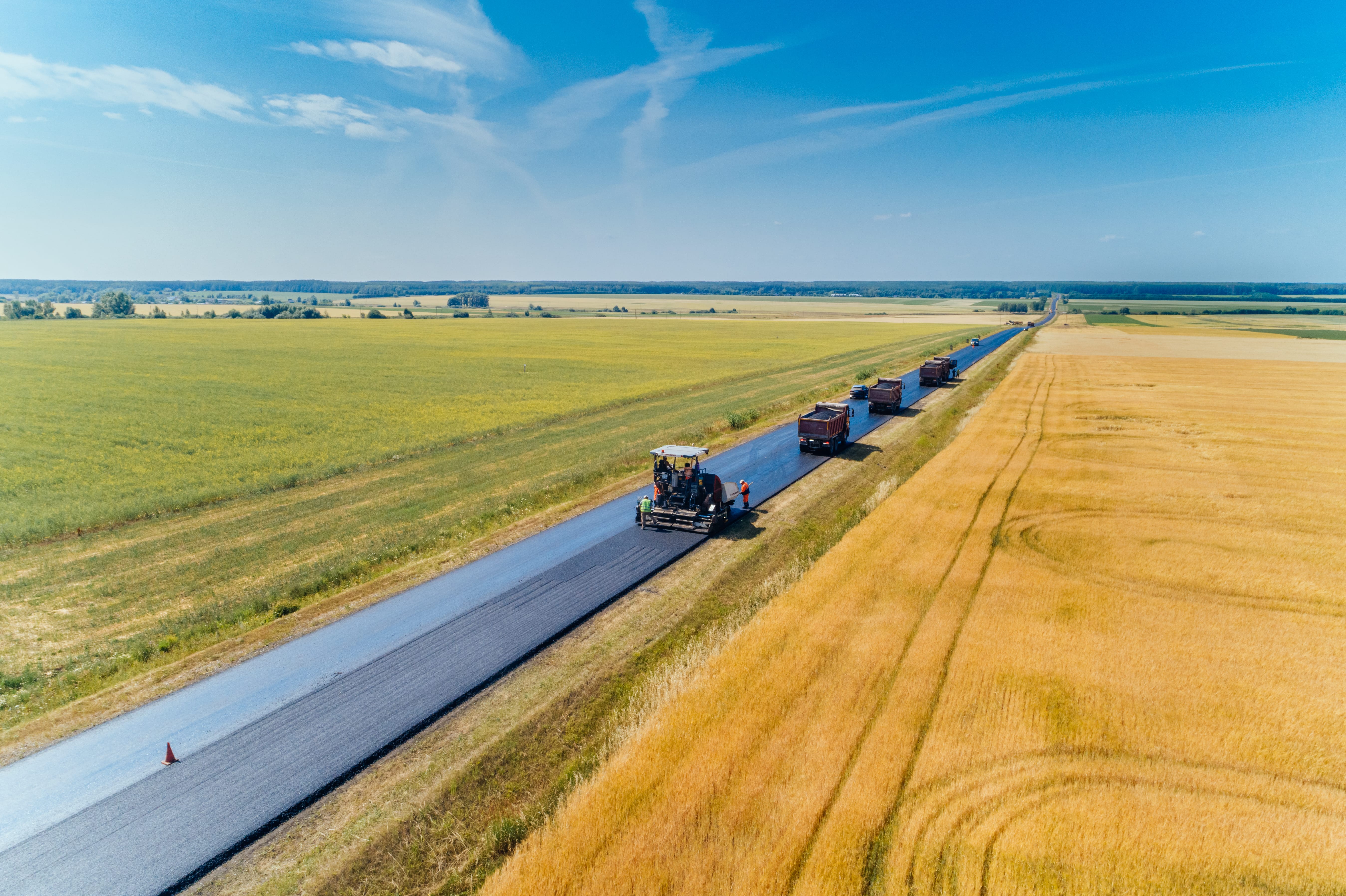 Сейчас на участке продолжается укладка верхнего слоя асфальтобетонного покрытия проезжей части и обустройство прикромочных водоотводных лотков. Также выполняются работы по обустройству посадочных площадок и укреплению обочин.