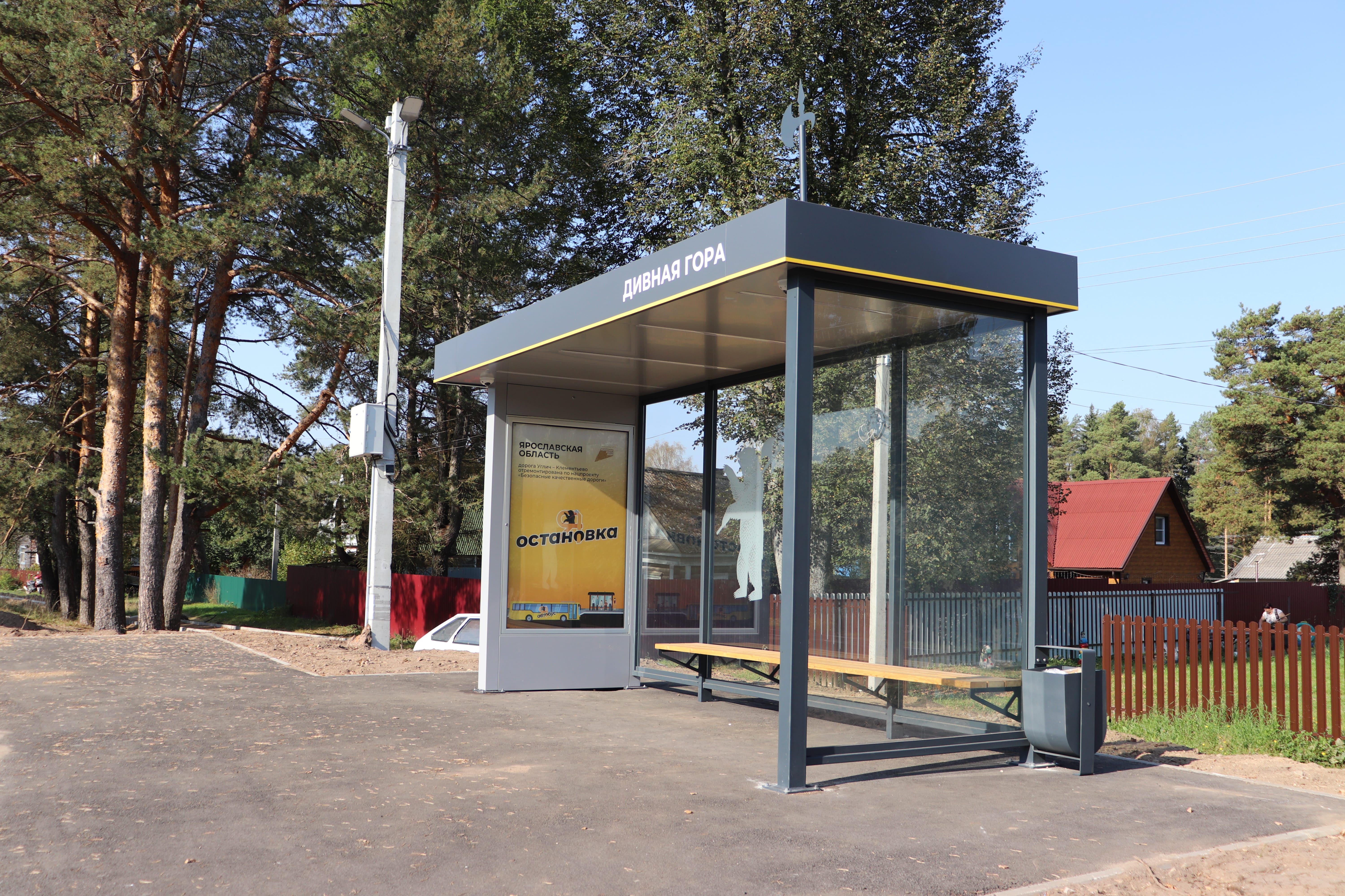«Так как здесь курсирует общественный транспорт, мы предусмотрели обновление автобусных павильонов. Три старых павильона заменили на новые, железобетонные, а в самом селе Дивная Гора сделали остановку нового типа, оборудованную камерами видеонаблюдения и освещением. На региональной дорожной сети в этом году смонтировано уже 14 таких остановок, до конца сентября появятся еще две», ― рассказал заместитель председателя Правительства – министр дорожного хозяйства Ярославской области Роман Душко.